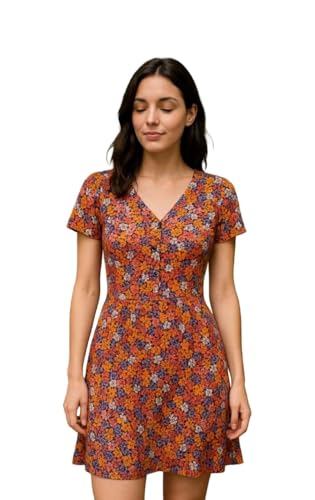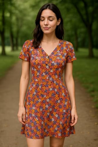 Generic - فستان قصير ايه لاين بقصة ايه لاين وطبعة زهور ورقبة على شكل حرف V واكمام قصيرة وازرار امامية للنساء من شي ان