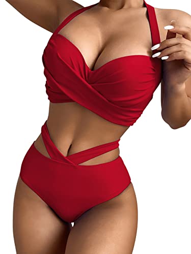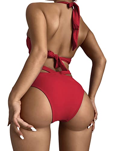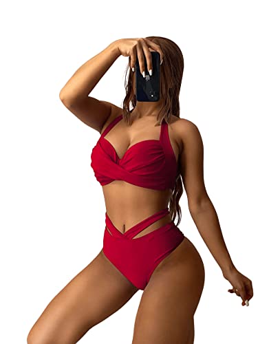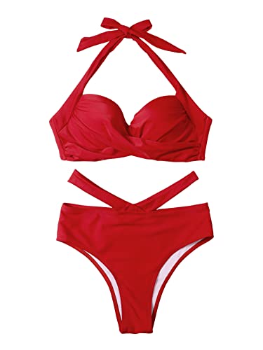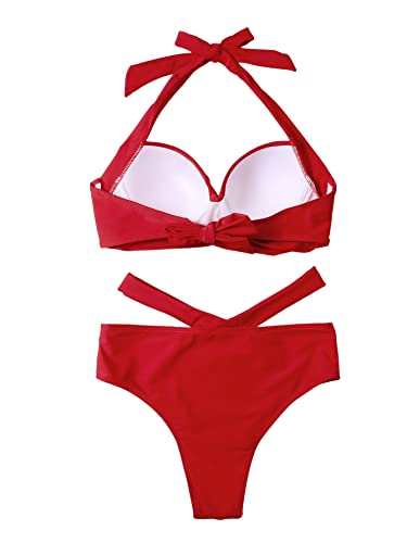 SHEIN - طقم مايوه بكيني قطعتين بحمالة للرقبة، يتكون حمالة صدر بوش اب وبانتي ثونج بخصر عال بفتحات جانبية للنساء من شي ان، ملابس سباحة برباط