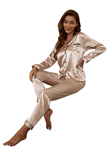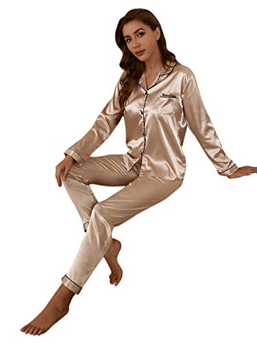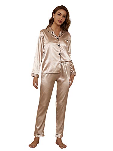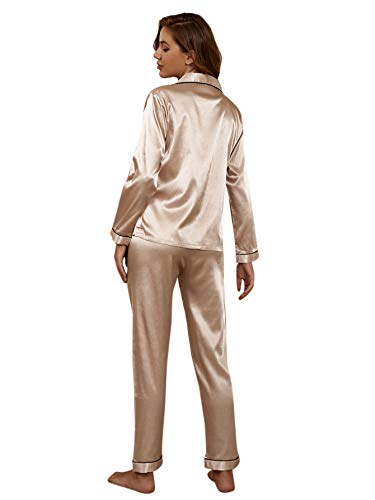 SHEIN - شي ان طقم بيجامة ساتان طويل بازرار سفلية للنساء - قطعتين، لون ذهبي فاتح، مقاس S