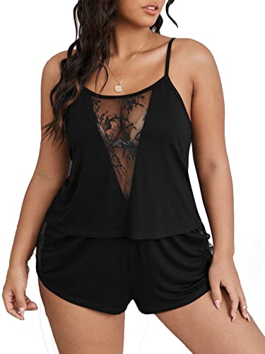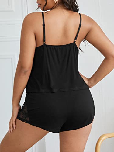 SHEIN - طقم بيجاما شورت للنساء من شي ان، توب بحمالات رفيعة بدون اكمام ومقدمة من الدانتيل وشورت قصير باستك عند الخصر، طقم ملابس نوم من قطعتين، مقاس كبير