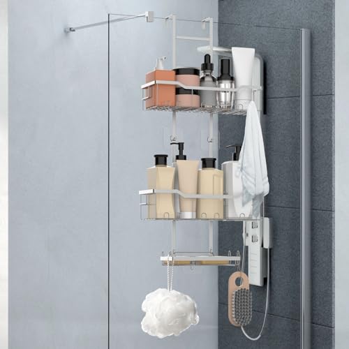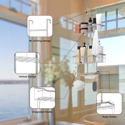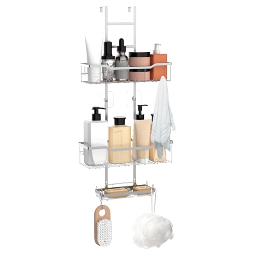 - 【حامل دش فوق الباب】يحتوي حامل الدش هذا على ثلاث طبقات. يمكن استخدام طبقتين لوضع جل الاستحمام والشامبو المختلفة، وتحتوي الطبقة السفلية على حامل صابون مصمم خصيصًا لوضع الصابون. هناك أيضًا خطافات مصممة لتخزين شفرات الحلاقة وكرات الحمام والفوط.