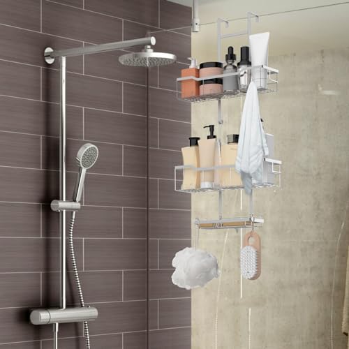 Shinoske - منظم دش معلق من طبقتين فوق الباب، رف تخزين معدني مقاوم للصدأ مع حامل صابون للحمام والمطبخ من شينوسكي، لون فضي