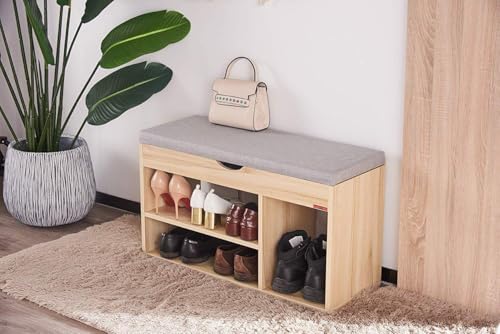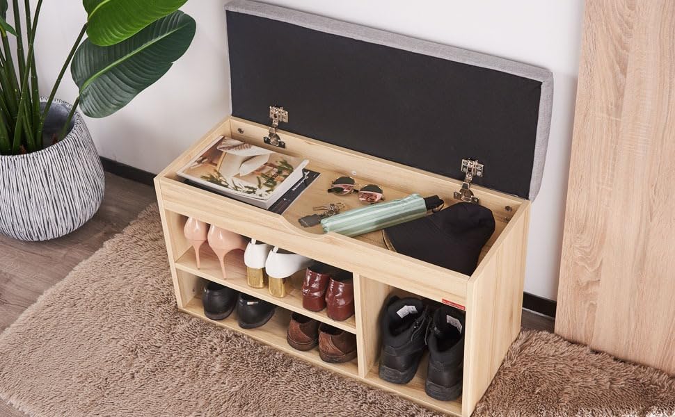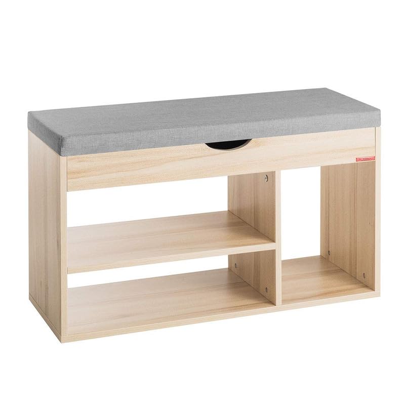 Generic - مقعد تخزين الاحذية، خزانة احذية للمدخل من خشب ام دي اف مع مقعد مبطن، منظم احذية متعدد الاقسام مع ارفف مفتوحة وتخزين جانبي، جزء علوي من القماش المريح للممر وغرفة النوم، خشب فاتح