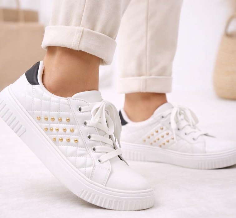 Generic - شوز حريمي سنيكرز أبيض ترندي كوتشي نسائي كاجوال مريح بتفاصيل ذهبية أنيقة حذاء عملي للخروجات اليومية من كيان للتجارة والتوزيع كود 5001 (ابيض ف اسود, 39)