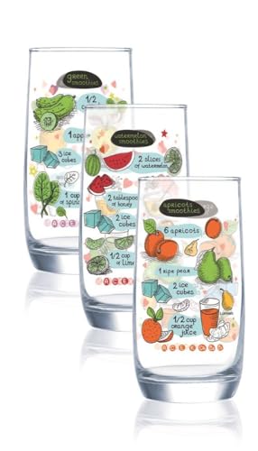 - تصميم متعدد الاستخدامات: مجموعة من 3 أكواب زجاجية شفافة تتميز برسوم توضيحية ساحرة لوصفات السموذي - مثالية لتقديم العصائر أو الحلويات أو الصلصات أو كأكواب تذوق