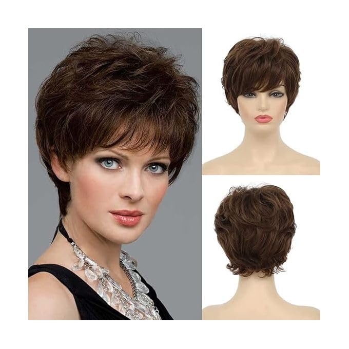 Generic - باروكة شعر قصيرة بني، شعر مستعار نسائي بطبقات، قصة بيكسي مع غرة