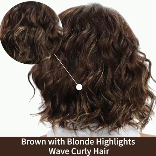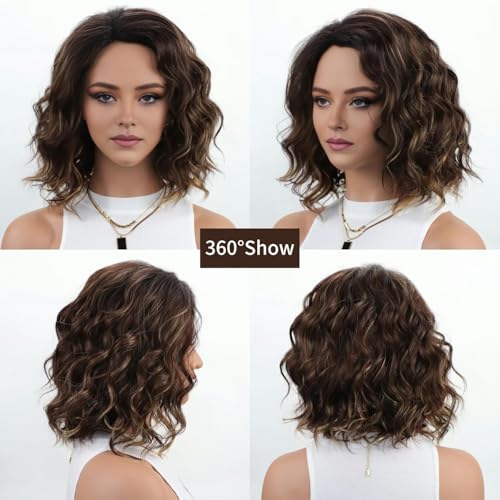 Generic - باروكة شعر قصيرة مموجة بألوان أومبري للنساء بطول متوسط من 28 سم إلى 32 سم مجعدة ذات مظهر طبيعي للحفلات اليومية مزيج بني مع هايلايت أشقر، JW327-N 8/27
