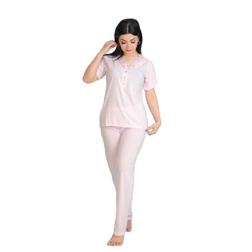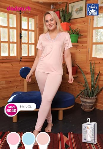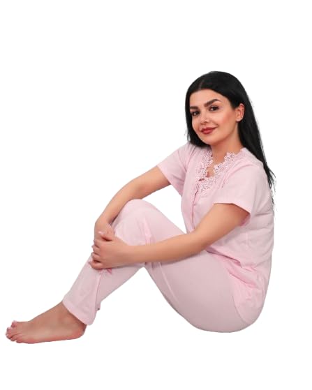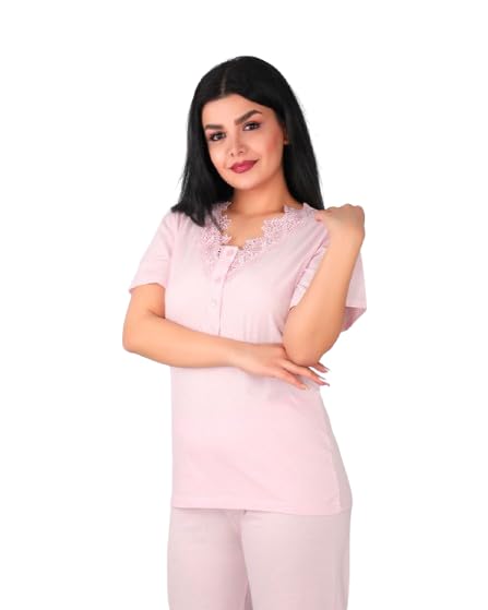 Shower - بيجامة صيفي مميزة بأكمام قصيرة - بيجاما حريمي صيفي بألوان هادئة وتفاصيل هادئة (زهر, L)