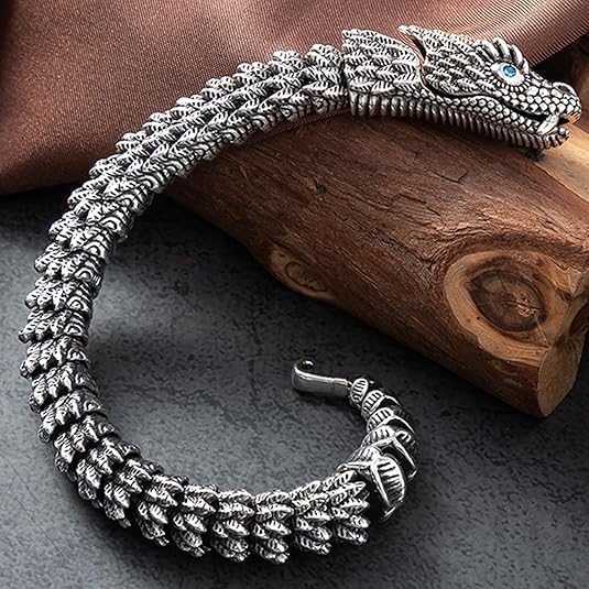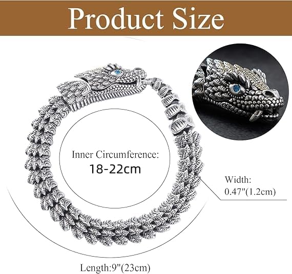 SHOWDAY - سوار بشكل ثعبان للرجال ملتف بنمط فضي عتيق بتصميم رأس تنين قابل للتعدي من شو داي