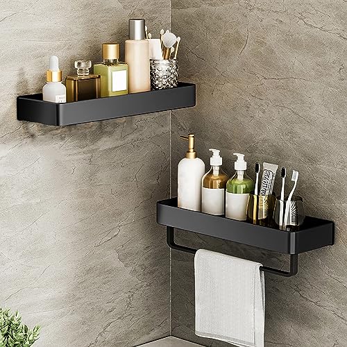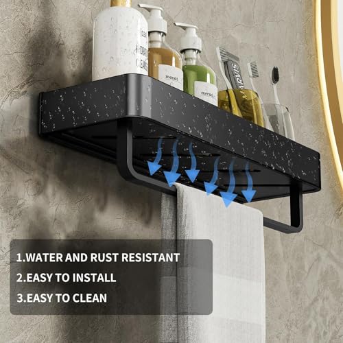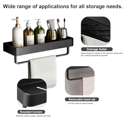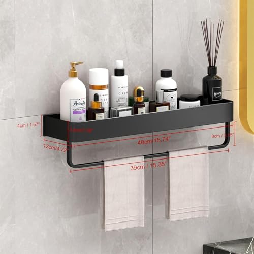 ILIKEPOW - رف دش بدون ثقب، سلة دش ذاتية اللصق من الألومنيوم مع حامل فوطة وخطافات، رف حمام مقاوم للصدأ، رف حائط للحمام والمطبخ، أسود، 40 سم