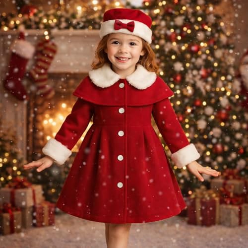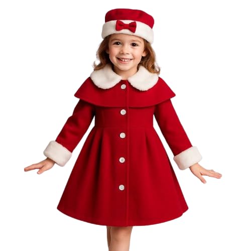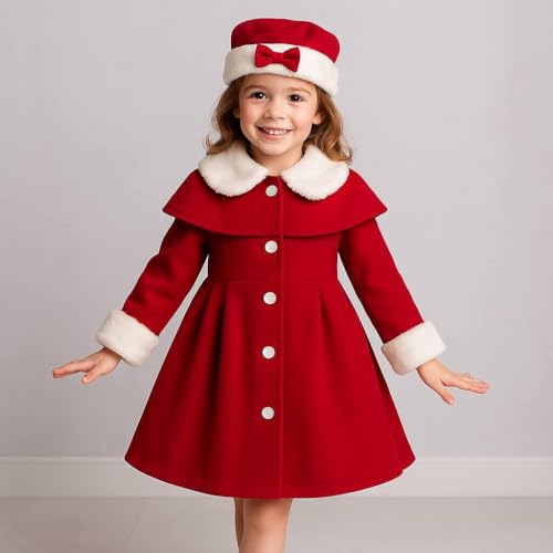 Generic - فستان للفتيات شتوى، مع قبعة، ياقة بيضاء فرو، أكمام طويلة، أزرار أمامية - خامه جوخ - موديل رقم #: 633