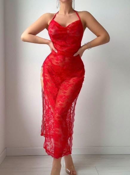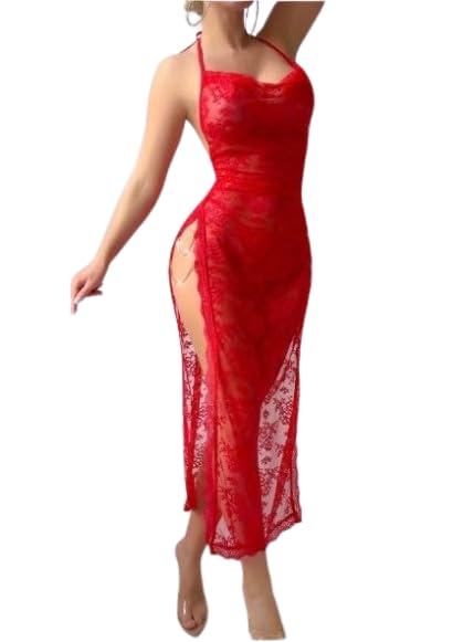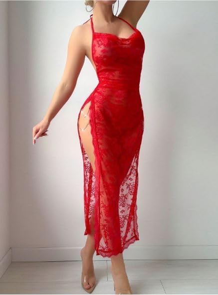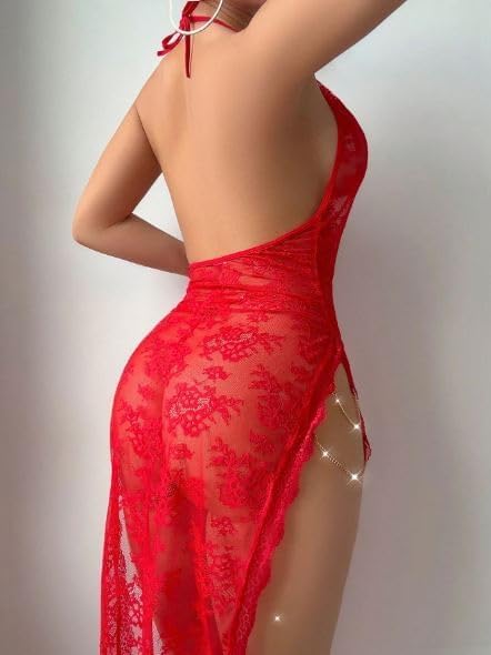 Generic - قميص نوم لانجري طويل تل ودانتيل بفتحة جانبية مزينة بسلاسل