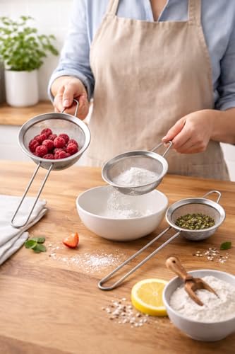 - 3 أحجام عملية للطهي اليومي - تمنحك المجموعة المكونة من 3 قطع المصفاة المناسبة في كل مرة، بدءًا من غربلة مكونات الخبز إلى غسل الفواكه أو تصريف المعكرونة للوجبات العائلية.
