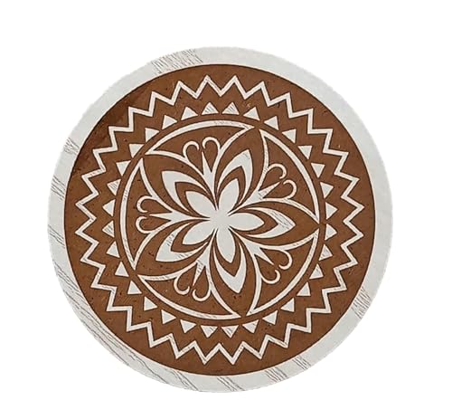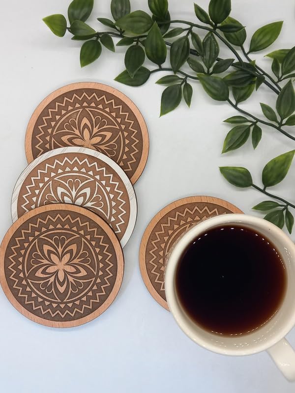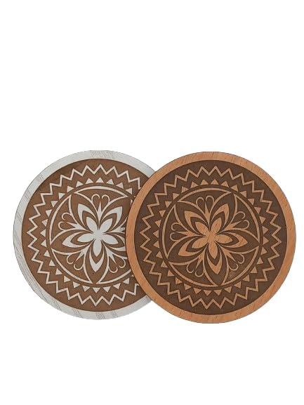 SIGN & DESINE - قاعدة أكواب/كوستر خشبي مستدير بتصميمات ورود فنية مع حفر ليزر غائر، سُمك 9.5 × 9.5 × 0.6 مللي - بيج RCO FL 03L