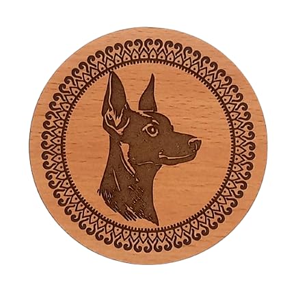 SIGN & DESINE - قاعدة أكواب/كوستر من ساين اند ديزاين، بتصميم خشبي مستدير، محفورة برسمة وجه كلب فصيلة دوبرمان، سمك 6 ملم - بلون هافان، 9.5 × 9.5 × 0.6 سم