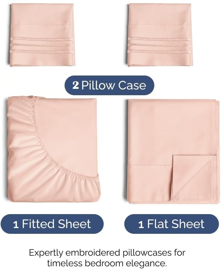 - ★ طقم ملاءات سرير من 4 قطع: 1 ملاءة مثبتة مقاس (180 × 240 سم) و1 ملاءة مسطحة مقاس (180 × 240 سم) و2 كيس وسادة (50 × 70 سم).