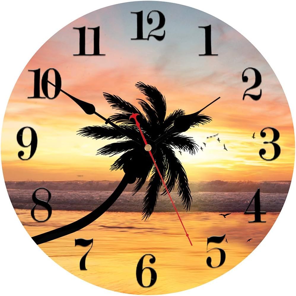 Generic - ساعة حائط صامتة بدون تكتكة، حركة مسح دقيقة ممتازة، ساعة حائط خشبية، ديكور عصري للمطبخ وغرفة المعيشة وغرفة الطعام وغرفة النوم والمكتب (تصميم غروب الشمس للشاطئ) كوارتز 20 سم