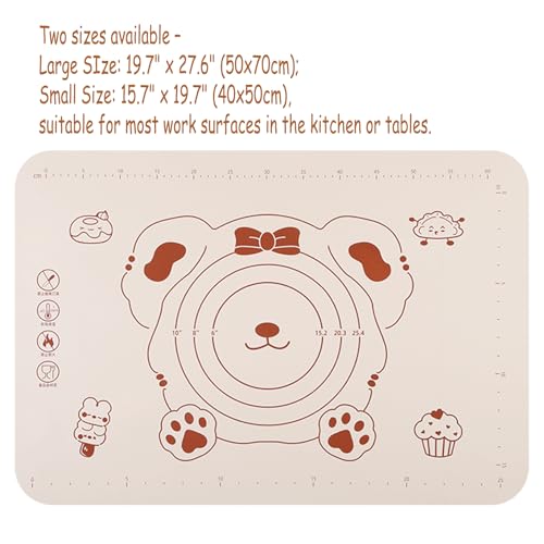 - يتوفر مقاسان - مقاس كبير: 19.7 انش × 27.6 انش (50 × 70 سم)؛ مقاس صغير: 15.7 انش × 19.7 انش (40 × 50 سم)، مناسب لمعظم أسطح العمل في المطبخ أو الطاولات. يمكن استخدام بساط السيليكون القابل لإعادة الاستخدام كسجادة لفرد المعجنات أو بساط للخبز في الفرن أو مفرش لسطح الطاولة أو مفرش طاولة أو بساط للحرف اليدوية.