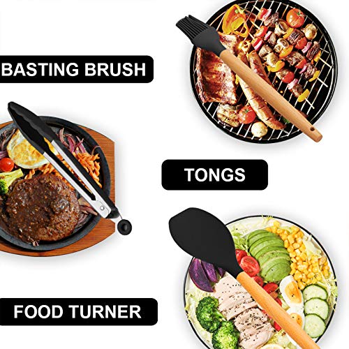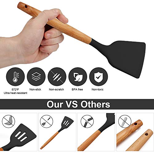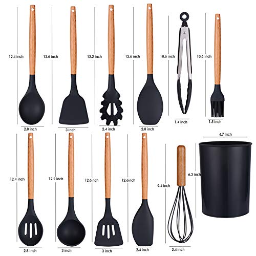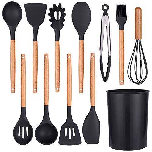 Spaceshoop - ادوات مطبخ مصنوعة من السيليكون والخشب بتصميم غير لاصق ومقاوم للحرارة وغير قابل للخدش من اردير لايف مع حامل ادوات المطبخ وملعقة سباتولا، 12 قطعة، اسود