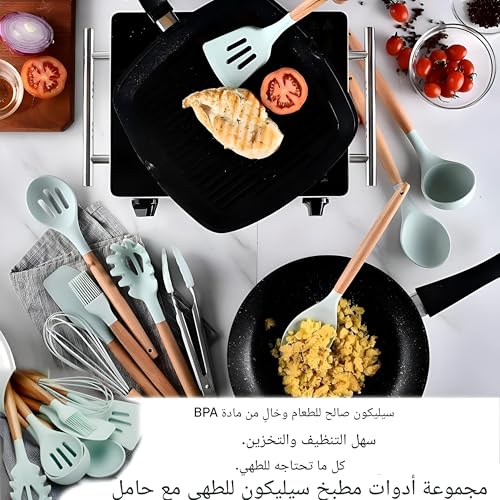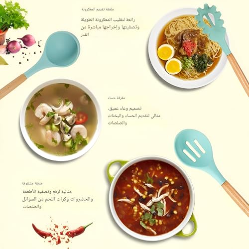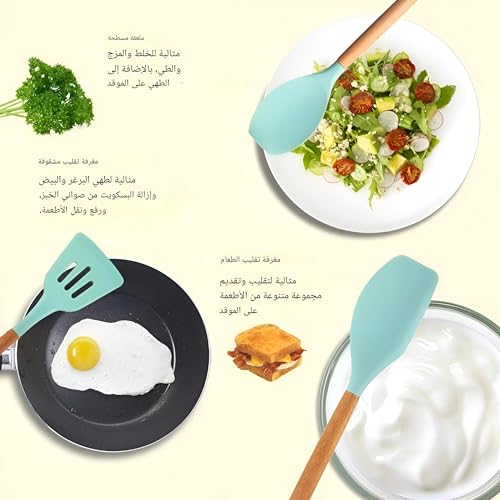 Generic - ادوات طبخ من السيليكون - مجموعة مقاومة للحرارة مكونة من 12 قطعة تتضمن ملاعق مسطحة وملاعق خشبية لاواني الطبخ غير اللاصقة، مثالية لجميع احتياجاتك في الطهي