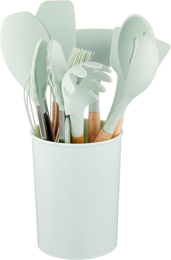 - مجموعة متكاملة: طقم مطبخ يتكون من ١١ قطعة من السيليكون عالي الجودة مع حامل بلاستيكي أنيق بلون تركوازي
