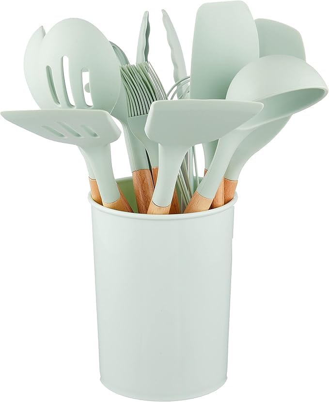 Generic - طقم أدوات مطبخ سيليكون ١١ قطعة مع حامل بلاستيك، مقابض خشبية، لون تركواز