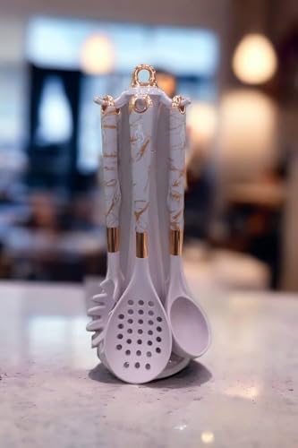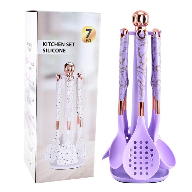 Generic - طقم أدوات مطبخ سيليكون، 7 قطع، مع تفاصيل ذهبية وردية، حامل وأدوات طبخ