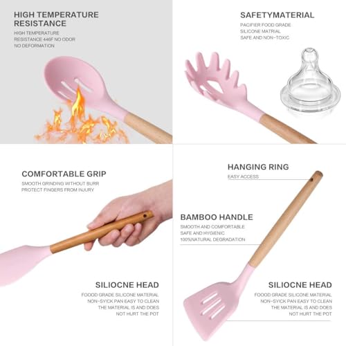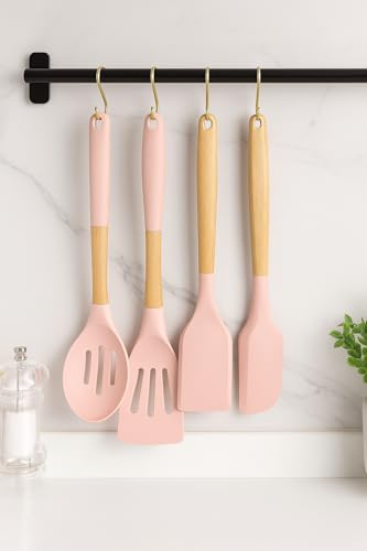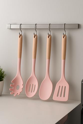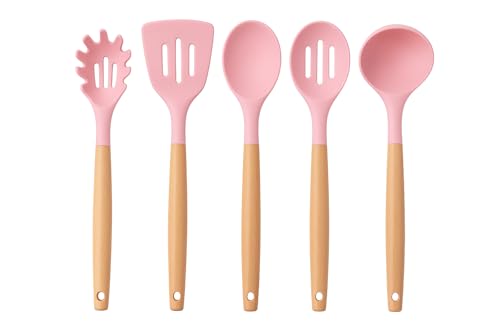 Happy Home - مجموعة أدوات مطبخ من السيليكون - تتضمن مغرفة وملعقة سباتولا وملعقة لتقليب الطعام ومغرفة مكرونة مقاومة للحرارة حتى 230 درجة مئوية مقابض خشبية، مجموعة أدوات مطبخ غير لاصقة (خالية من مادة بيسفينول أ) 6