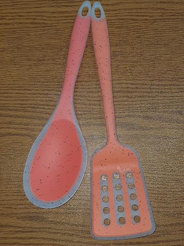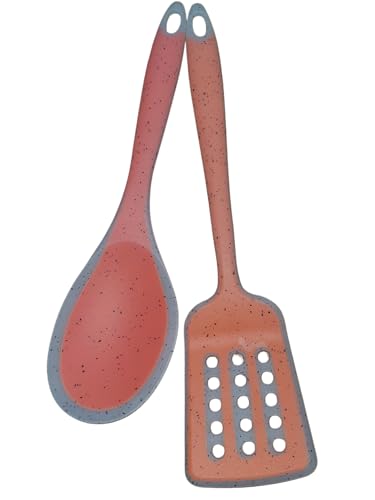 Generic - مجموعة ادوات مطبخ من السيليكون، ملعقة وملعقة تقليب مشقوقة، رمادي وبينك مرجاني، تصميم منقط