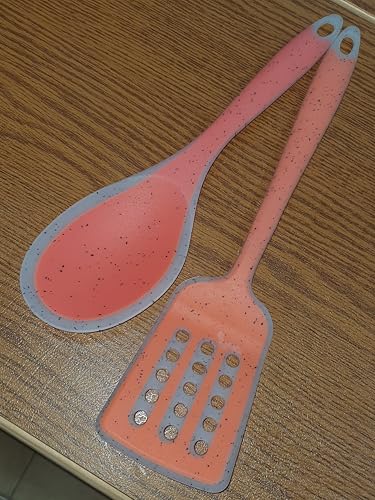 - التصميم: مجموعة أدوات المطبخ المكونة من قطعتين تتميز بملعقة وملعقة تقليب مشقوقة بنمط أنيق باللون الرمادي والوردي المرجاني