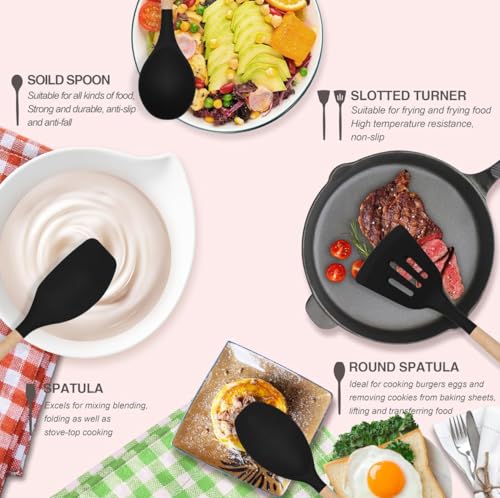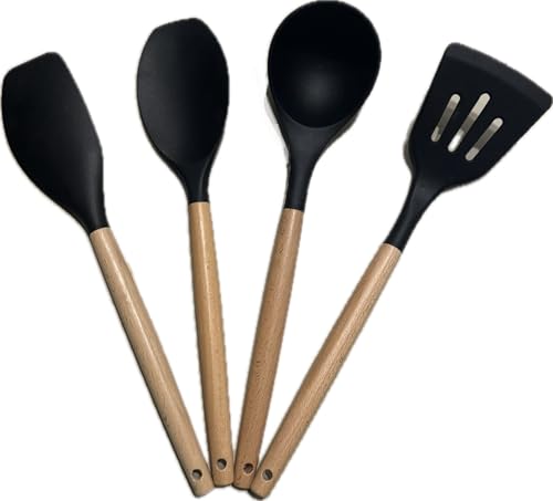 Generic - أواني مطبخ سيليكون بمقابض خشبية، أدوات تناول الطعام من 4 قطع، أسود