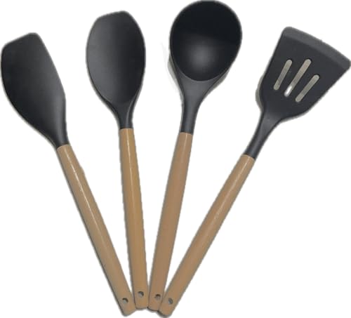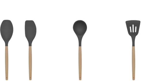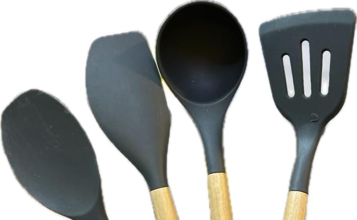 Generic - أدوات تناول الطعام للمطبخ سيليكون بمقابض خشبية، 4 قطع، لون رمادي
