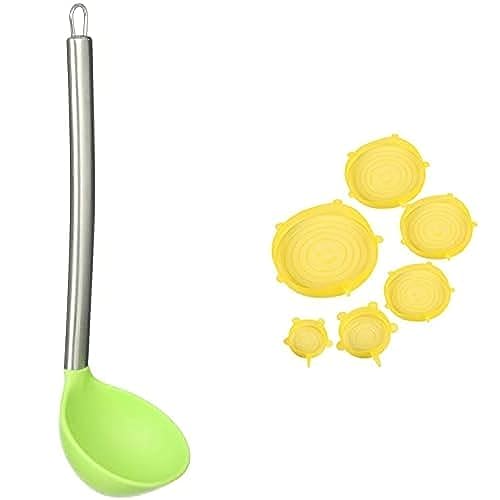 Generic - مجموعة مكونة من مغرفة سيليكون بيد ستانلس ستيل بلون اخضر + 6 اغطية مرنة من السيليكون للطعام الطازج باحجام مختلفة