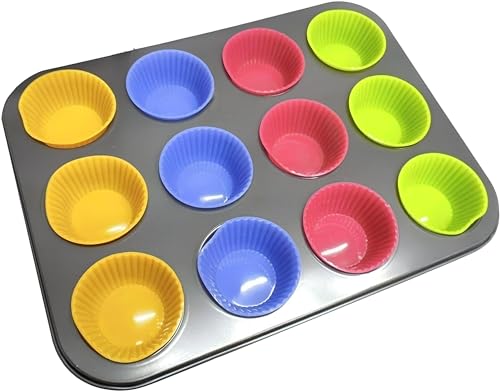 Generic - مجموعة خبز المافن السيليكون - استمتع بالخبز بدون مجهود باستخدام قوالب السيليكون القابلة لإعادة الاستخدام البالغ عددها 12 في صينية متينة من الفولاذ الكربوني، مثالية للمافن والكعك الصغير اللذيذ!