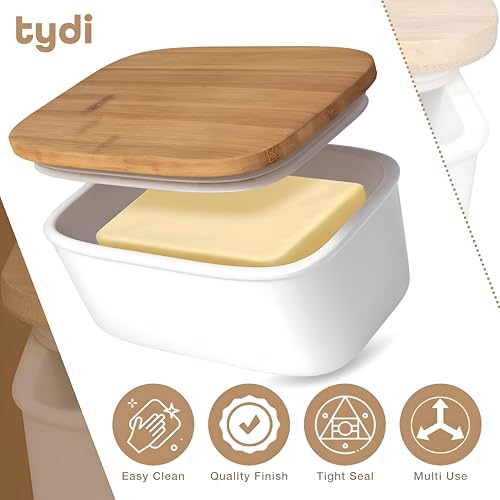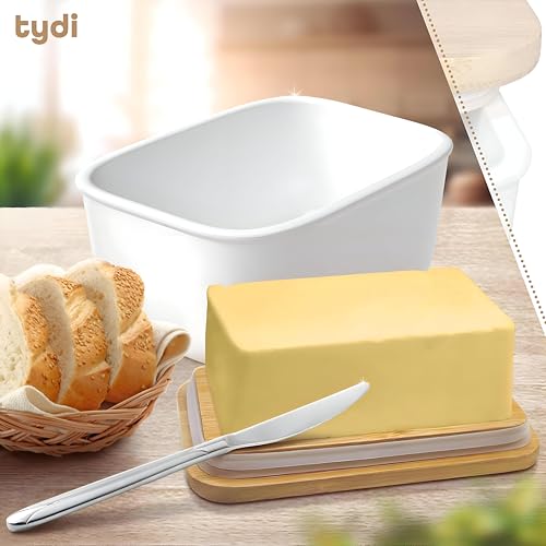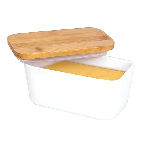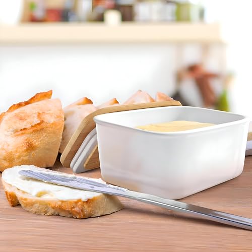 - طبق زبدة أنيق من البورسلين مع غطاء من الخيزران الطبيعي - يضيف الهيكل الخزفي الأبيض (16 × 10.5 × 7 سم) مظهرًا أنيقًا بينما يحافظ الغطاء القوي على المحتويات طازجة.