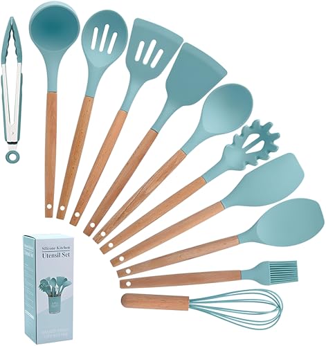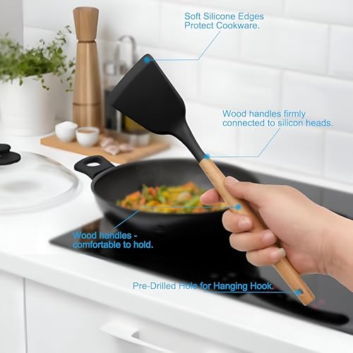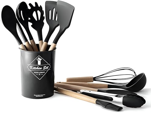 Generic - مجموعة ملاعق سباتولا من السيليكون مع حامل للطهي اليومي مقاومة للالتصاق والحرارة بمقبض خشبي أنيق لا يسبب السخونة مع تحكم آمن وسهل الاستخدام من 12 قطعة