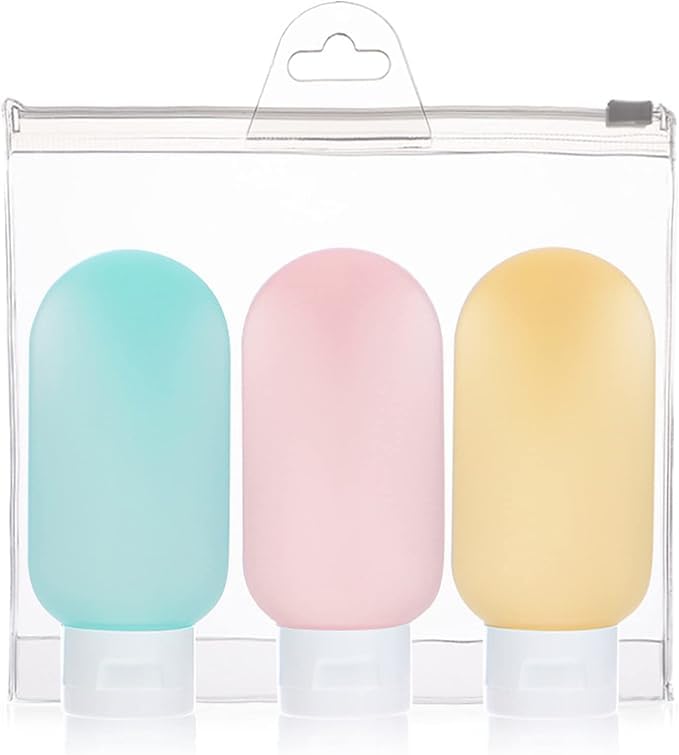 Daga - مجموعة زجاجة سفر مضادة للتسرب وقابلة لإعادة التعبئة والعصر بسعة 60 ملليلتر من السيليكون للشامبو والصابون السائل ومستلزمات العناية الشخصية مع ملصق وشنطة حمل شفافة، 3 قطع - متعددة الألوان