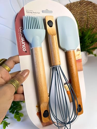 Generic - مجموعة خفاقة وملعقة سباتولا من السيليكون، فرشاة سيليكون - مجموعة ادوات مطبخ من ثلاث قطع مصنوعة من السيليكون والخشب، مصممة للطبخ اليومي مع اداء غير لاصق وسهولة الاستخدام، مثالية لكل من امات
