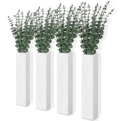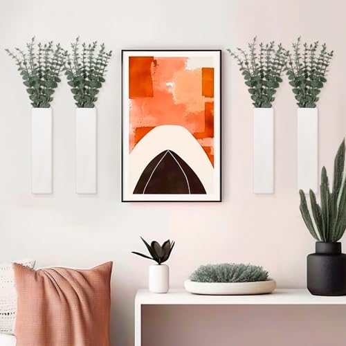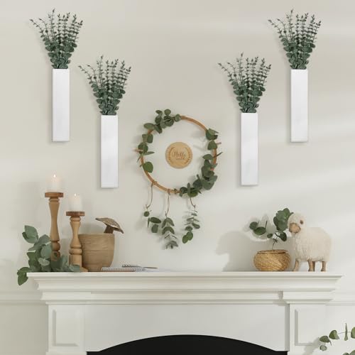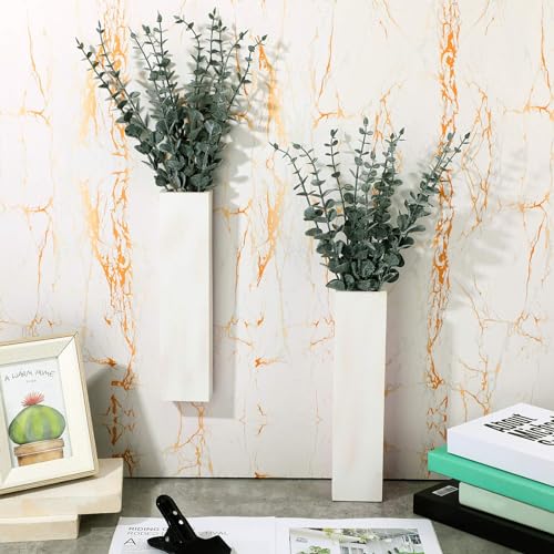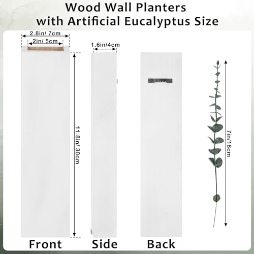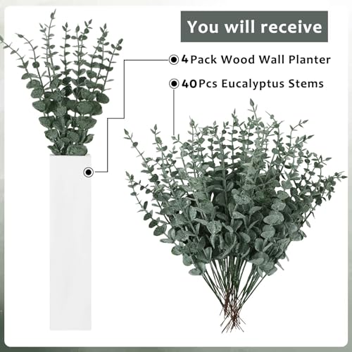 SiliFine - اصيص نباتات حائط خشبي من 4 قطع مع 40 قطعة سيقان الاوكالبتوس الاصطناعية مزهريات خشبية معلقة للزهور جيب لمستلزمات ديكور الحائط سيليفاين أبيض