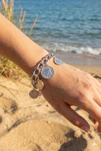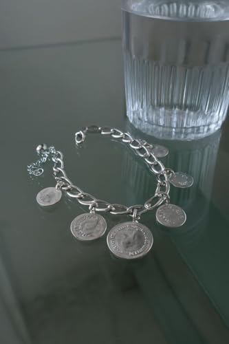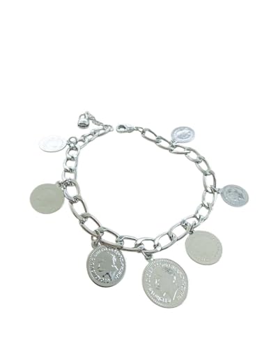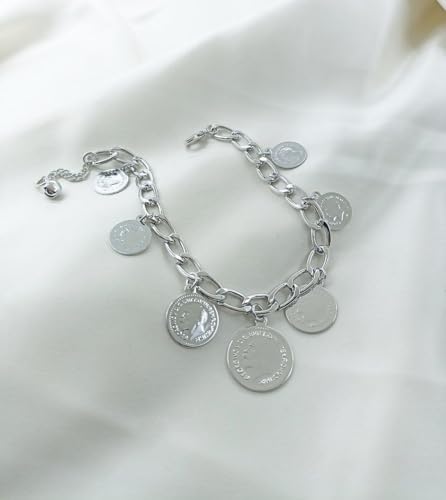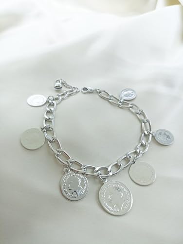 Generic - سوار سلسلة فضي مع تعليقة على شكل عملة معدنية، نمط سلسلة ربط، قفل لوبستر