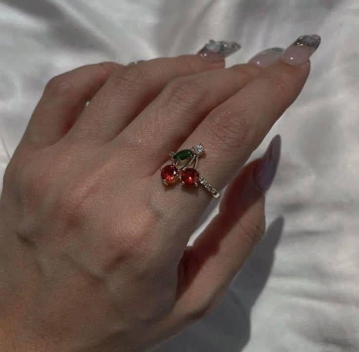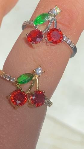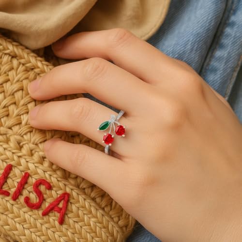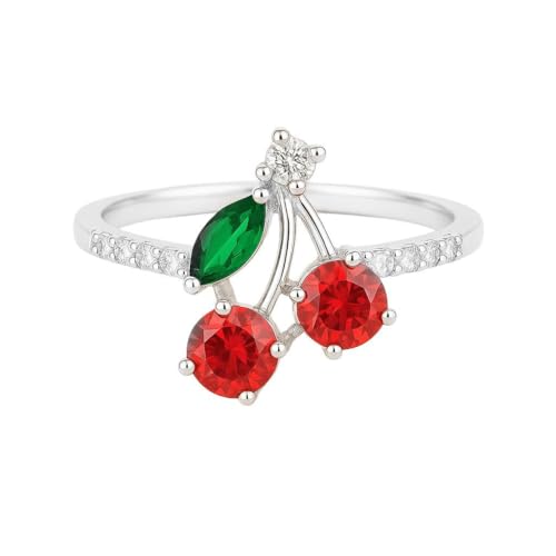 Generic - خاتم فضي مستوحى من الكرز مع زركونيا مكعب بلون أحمر وأخضر - تصميم فاكهة انيق للنساء والبنات