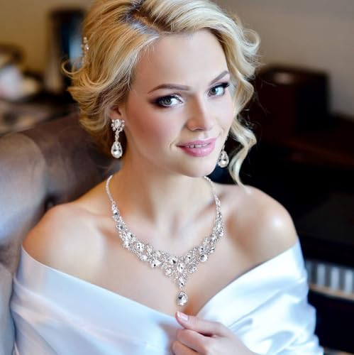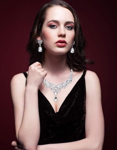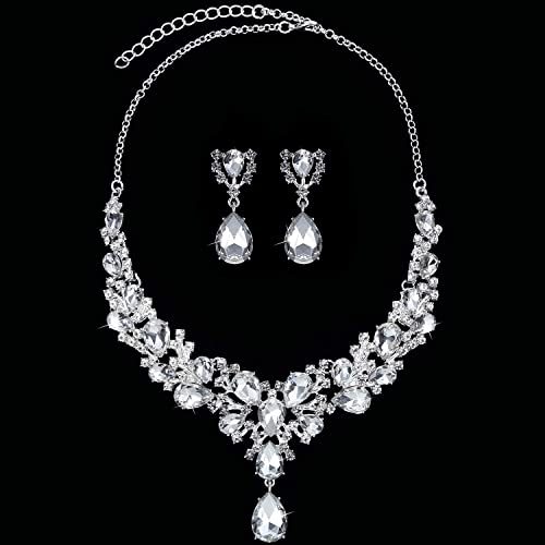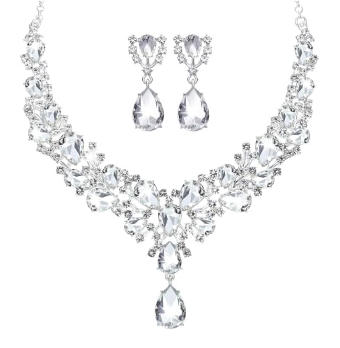 fashion mania - مجموعة مجوهرات فضية للنساء رسمية، مجموعة مجوهرات كريستال على شكل دمعة للنساء قلادة واقراط