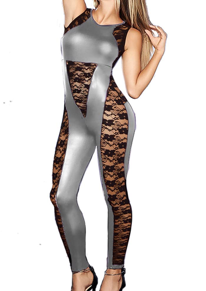 Generic - لانجيري جلدي بطرف دانتيل بلون فضي واسود