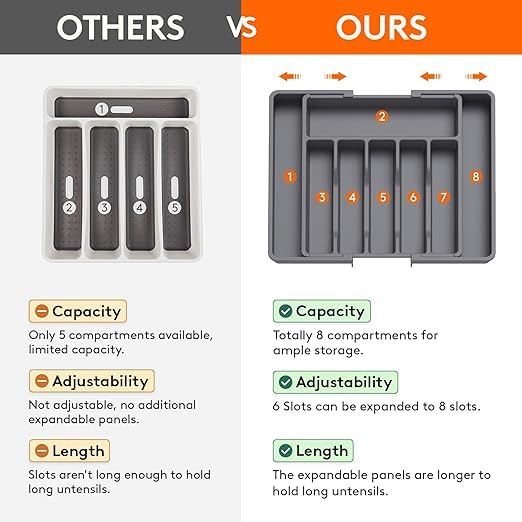 - سعة كبيرة: قم بتنظيم درج مطبخك وتوفير مساحة أكبر مع منظم الأدوات الفضية هذا. تأتي مع لوحين قابلين للتوسيع على اليسار واليمين لتخزين المزيد من أدوات المائدة وأدوات المطبخ