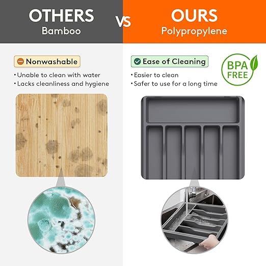 - مادة فاخرة: مصنوع من مادة البولي بروبيلين الممتازة السميكة والمتينة، منظم أدوات المائدة خالٍ من البيسفينول ايه لذلك يمكنك الاطمئنان إلى أنه آمن للاستخدام مع جميع أشكال أدوات المائدة. الهيكل المتين يعني أنه مصمم ليدوم لفترة طويلة