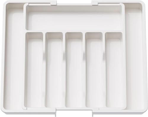 Infinite - منظم ادوات المائدة الفضية - منظم ادراج المطبخ قابل للتوسيع، منظم ادوات مائدة قابل للتعديل، منظم ادراج ادوات تناول الطعام للشوك والسكاكين، منظمات المطبخ متعددة الاغراض وحل التخزين، (ابيض)