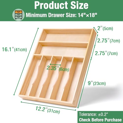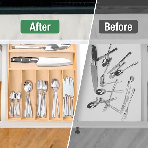 bryantye - منظم ادوات المائدة الفضية درج المطبخ 13 انش × 17 ادراج الخيزران وحامل وصينية مع فواصل مخددة لادوات والشوك والملاعق 7 اقسام
