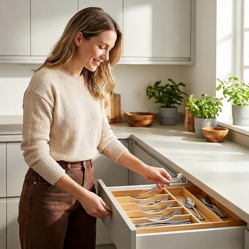 - منظم أدراج من الخيزران: جرب متانة وأناقة هذا المنظم الفاخر المصنوع من الخيزران. مصنوع بجودة فائقة، ويوفر أداءً أفضل ضد الخدوش ويدوم لفترة أطول. يضيف اللون والملمس الطبيعي لمسة من الرقي إلى ديكور مطبخك. تمنع الفواصل والقاعدة المتينة الاعوجاج، بينما يسمح تصميم الأخاديد المنحنية بسهولة الوصول إلى السكاكين والشوك.