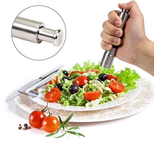 - طقم مطحنة الملح والفلفل الممتاز هذا المتين مجهز بزر ضخ سهل الاستخدام يعمل بلمسة واحدة، بينما تضمن أعمدة الطحن المصممة هندسيًا لدينا طحنًا فعالًا. ما عليك سوى الضغط على الزر الموجود في الأعلى وستقوم المطحنة الخاصة بنا بالباقي من أجلك.