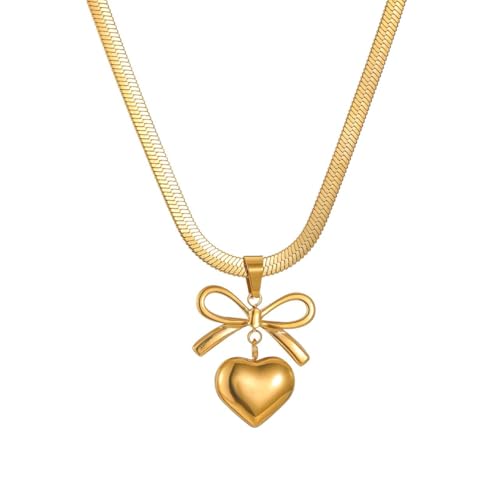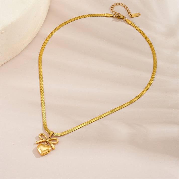 Generic - قلادة كلاسيكية بسيطة بلون ذهبي من الستيل على شكل فيونكة حب وقلب وشرابة على شكل ثعبان، مجوهرات عصرية هدية للنساء